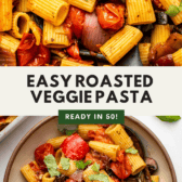 Roasted veggie pasta is best served right away, when the noodles are at their sauciest. As they sit, the noodles will absorb the sauce and become soggy.