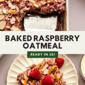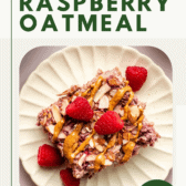 This baked raspberry oatmeal is one of my favorite breakfasts to toss in the oven first thing on a spring or summer morning or right at the start of the weekend. Whether they’re still hot from the oven or cooled down, I love serving the slices in bowls with a splash of plant milk, a dollop of yogurt, a drizzle of almond butter, or some extra raspberries sprinkled on top.